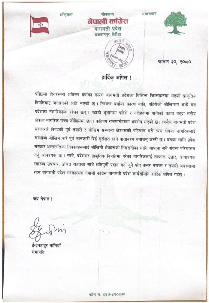 हेटौंडा, ३० साउन/अविरल बर्षाका कारण बागमती प्रदेशमा भएको प्राकृतिक विपत्तिमा उद्धार तथा राहतका लागि नेपाली कांग्रेस बागमती प्रदेश समितिले अपिल गरेको छ ।