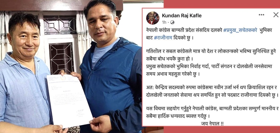 सामजिक सञ्जाल फेसबुकमार्फत प्रमुख सचेतक काफ्लेले संसदीय दलका नेता बहादुरसिंह लामा समक्ष राजीनामा पेस गरेको तस्बिर सार्वजनिक गर्दै काफ्लेले पदबाट राजीनामा दिएको जानकारी गराएका हुन् ।