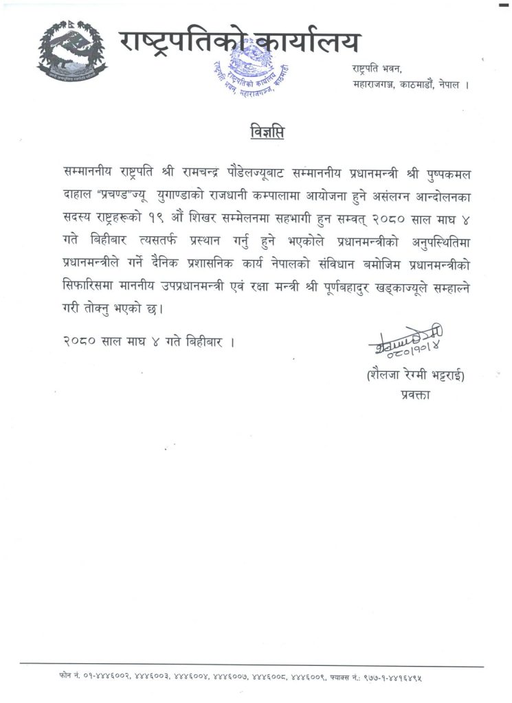 राष्ट्रपति रामचन्द्र पौडेलले प्रधानमन्त्रीको अनुपस्थिति मा प्रधानमन्त्रीले गर्ने दैनिक प्रशासनिक कार्य नेपालको संविधान बमोजिम प्रधानमन्त्रीको सिफारिसमा उपप्रधानमन्त्री एवं रक्षा मन्त्री खड्काले सम्हाल्ने गरी तोकेको राष्ट्रपति कार्यालयबाट जारी सूचनामा उल्लेख गरिएको छ ।