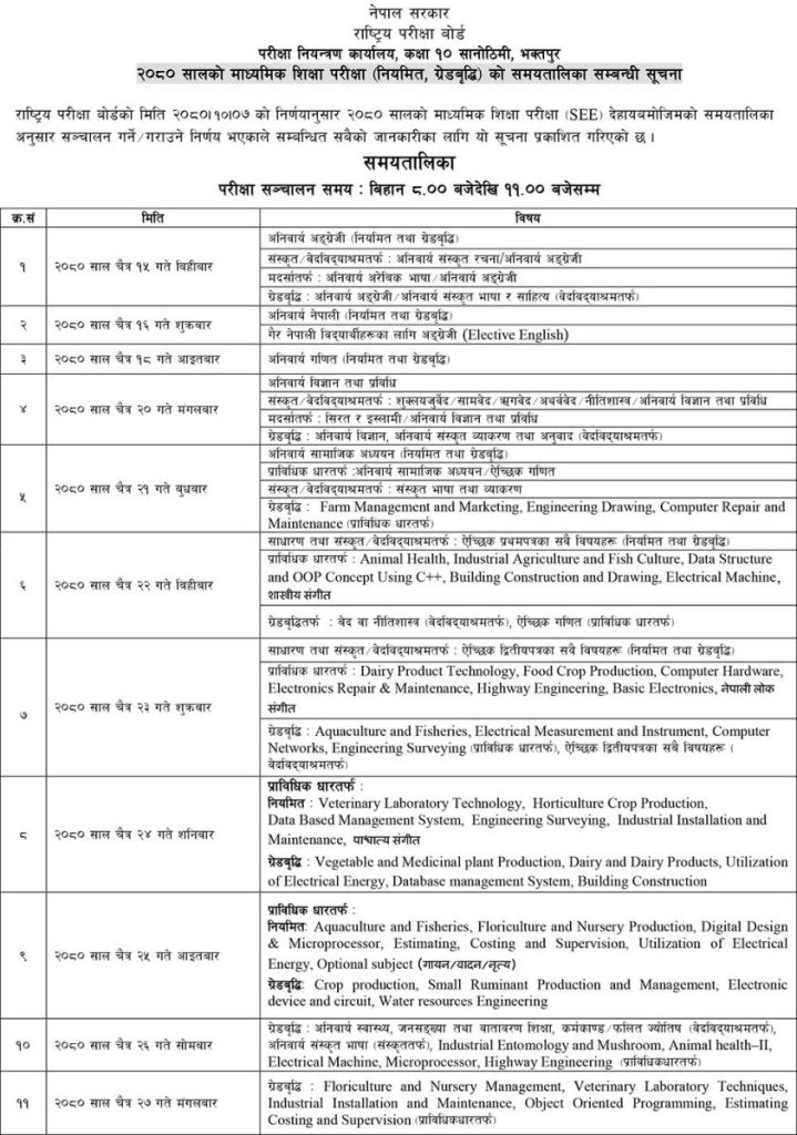 हेटौंडा, ८ माघ/यस वर्षको माध्यमिक शिक्षा परीक्षा (एसईई) चैत १५ गतेदेखि २७ गतेसम्म हुने भएको छ ।आज बसेको राष्ट्रिय परीक्षा बोर्डको बैठकले चैत १५ गतेदेखि एसईई परिक्षा सञ्चालन गर्ने निर्णय गरेको हो।